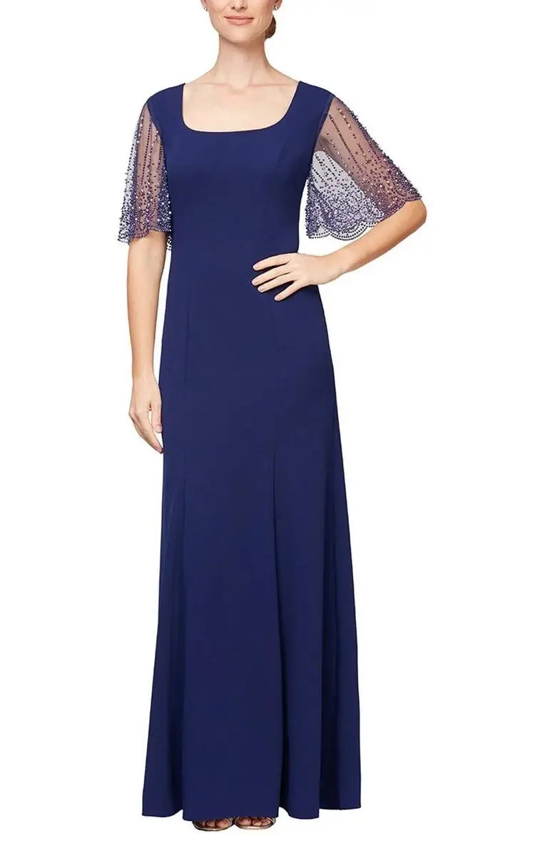 Cobalt Blue Sheath Dress with Beaded Sheer Flutter Sleeves – Perfect for Mother of the Bride, Mother of the Groom & Special Occasions – High Vibe Bride, Mission KS Make a bold yet elegant statement in this stunning Cobalt Blue sheath dress, designed for graceful movement and timeless appeal. The full-length stretchy crepe skirt offers a flattering, body-skimming silhouette that’s both comfortable and polished—ideal for the Mother of the Bride, Mother of the Groom, or any formal celebration. Delicate sheer flutter sleeves adorned with intricate beading add sparkle and sophistication, while providing soft coverage with an ethereal feel. This vibrant blue hue ensures you'll stand out in the most refined way. Discover this striking Cobalt Blue evening dress at High Vibe Bride in Mission, Kansas—where modern elegance and special occasion style meet to celebrate your most meaningful moments.