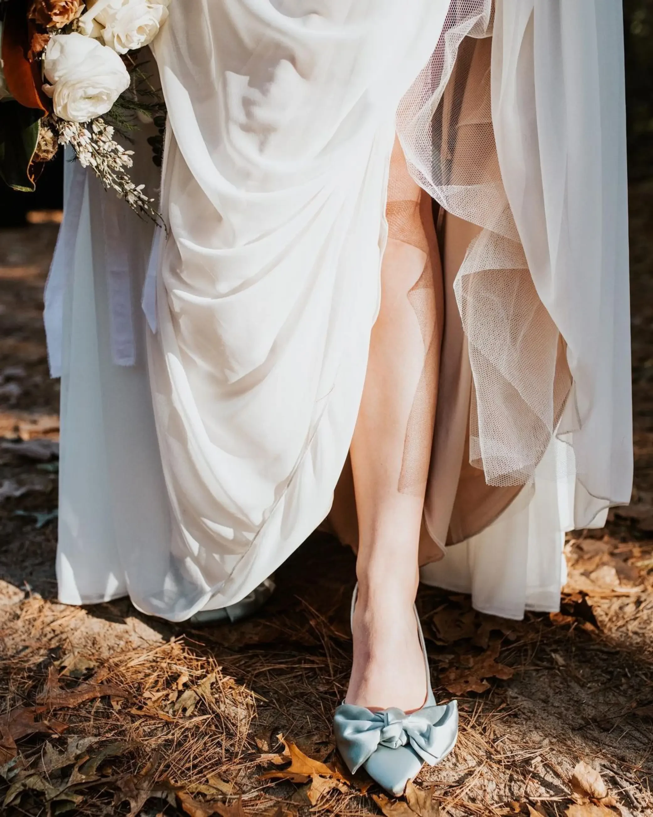 Most wedding gowns are actually off white/light ivory, and if yours is also, be sure to avoid shoes that are stark white—they’ll look too “white-white” next to your dress.