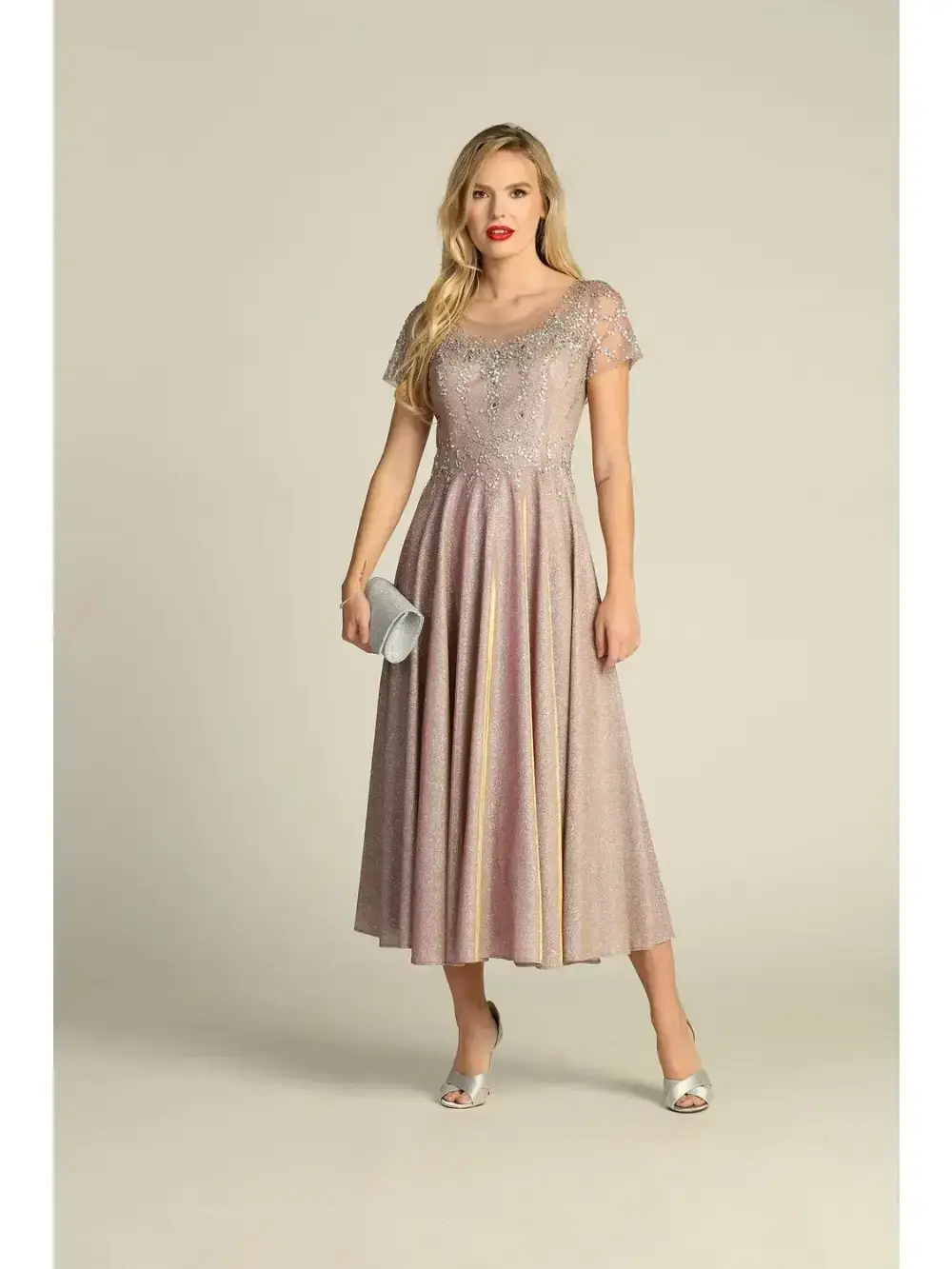 Sparkling A-line Mother of the Bride dress, tea length, featuring dazzling rhinestones and glitter for extra shimmer. Made from lightweight polyester, this rose gold gown offers elegant cap sleeves, an illusion neckline, and a silver-embellished bodice. Convenient pockets add modern practicality. Perfect for stylish Kansas City weddings, ideal for the mother of the bride or groom.