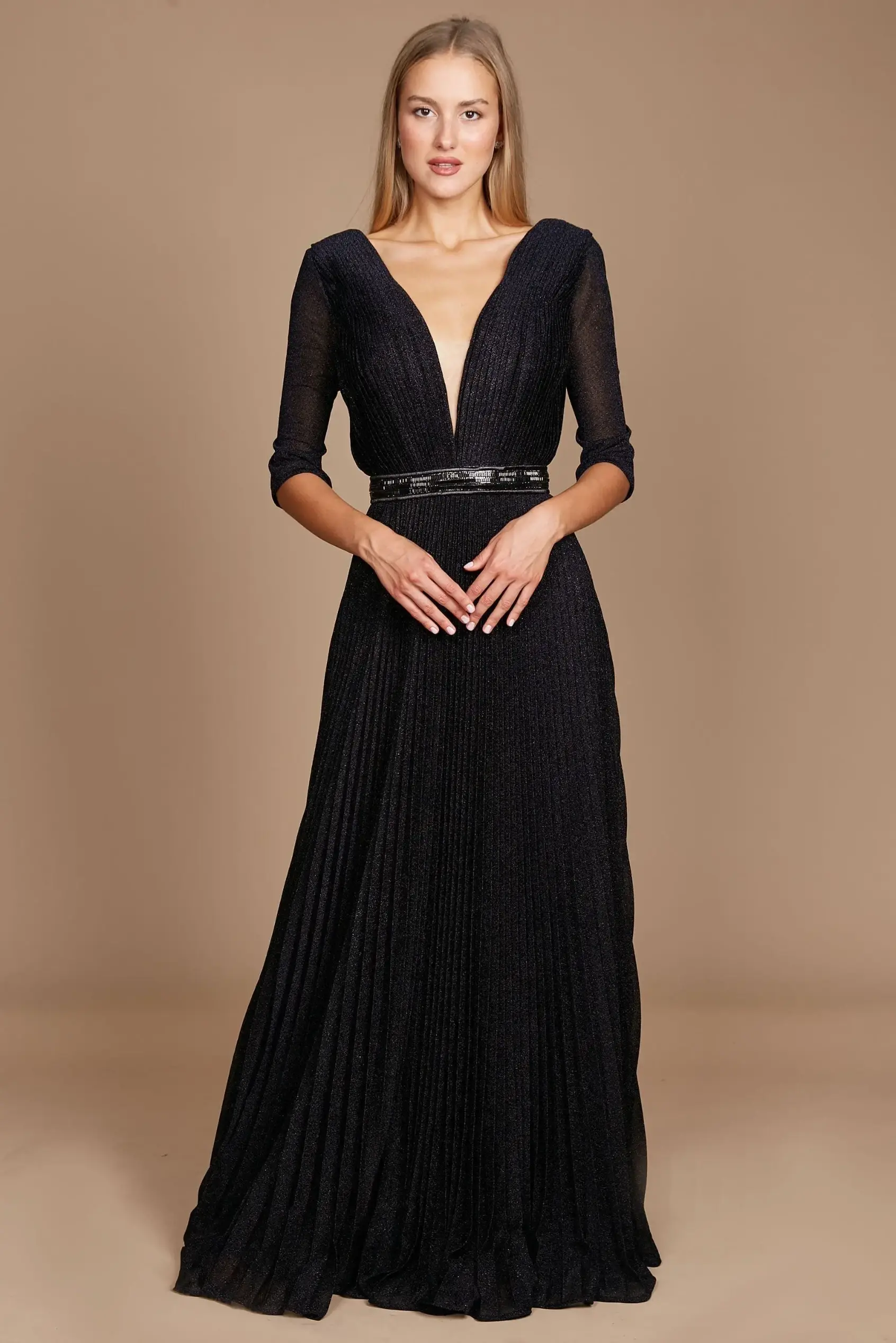 Mother of the Bride, Groom, or Special Celebrations – High Vibe Bride, Mission KS Step into elegance with this black A-line gown in size Medium, the perfect blend of modern style and timeless charm. Ideal for the Mother of the Bride, Mother of the Groom, or any formal occasion, this dress promises to turn heads and make you feel confident all day or night. With its flattering deep V-neckline, 3/4 length sleeves, and softly flowing pleated skirt, this dress exudes grace and movement. The beaded waist detail adds a touch of sparkle that elevates the look, creating a stunning silhouette. Find this elegant black formal dress at High Vibe Bride in Mission, Kansas, where sophisticated design meets exceptional comfort for your most unforgettable celebrations.