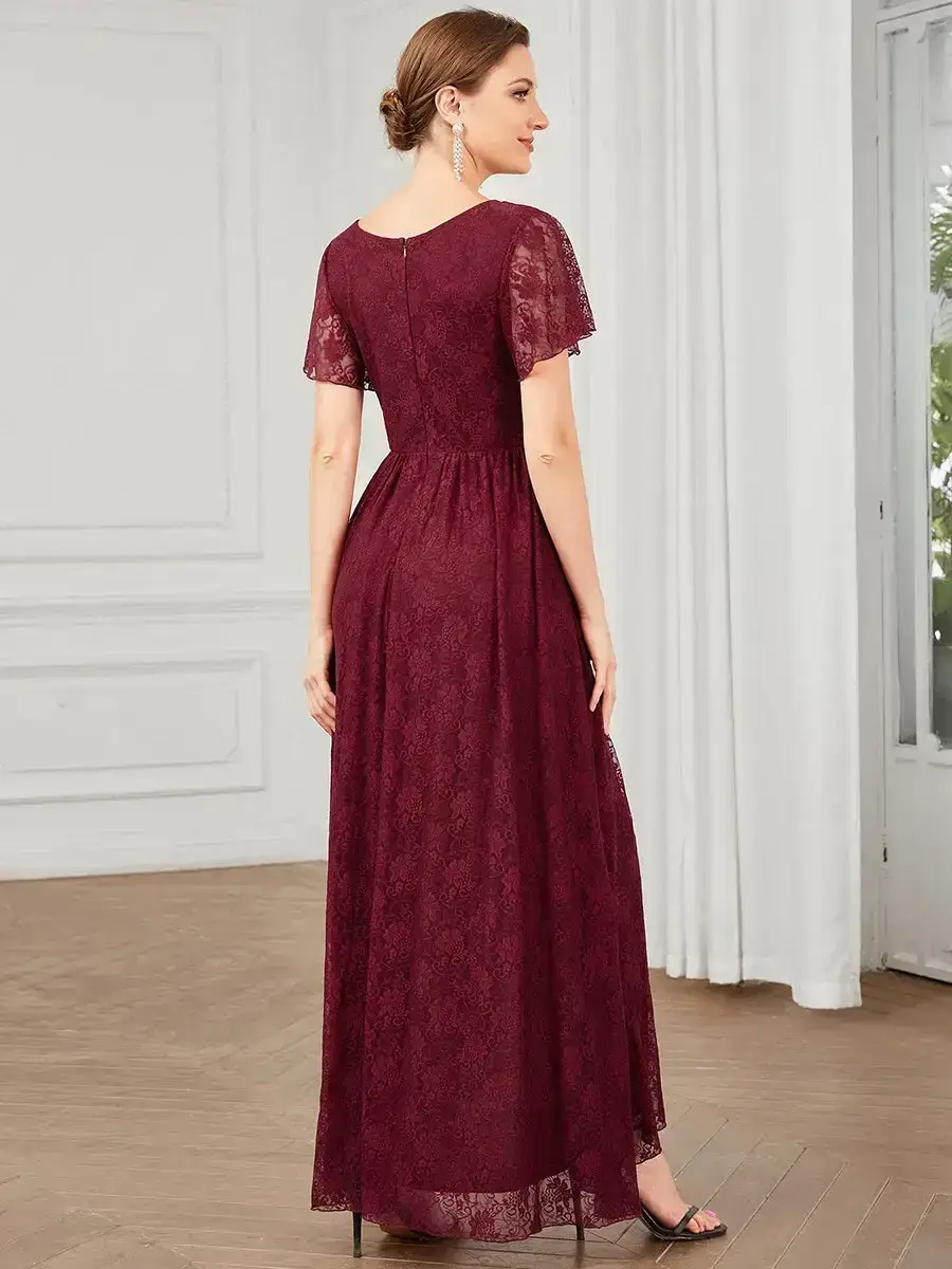 Sophisticated and feminine, this navy lace mock wrap dress showcases a V-neckline, sheer flutter sleeves, and pleated front accents.