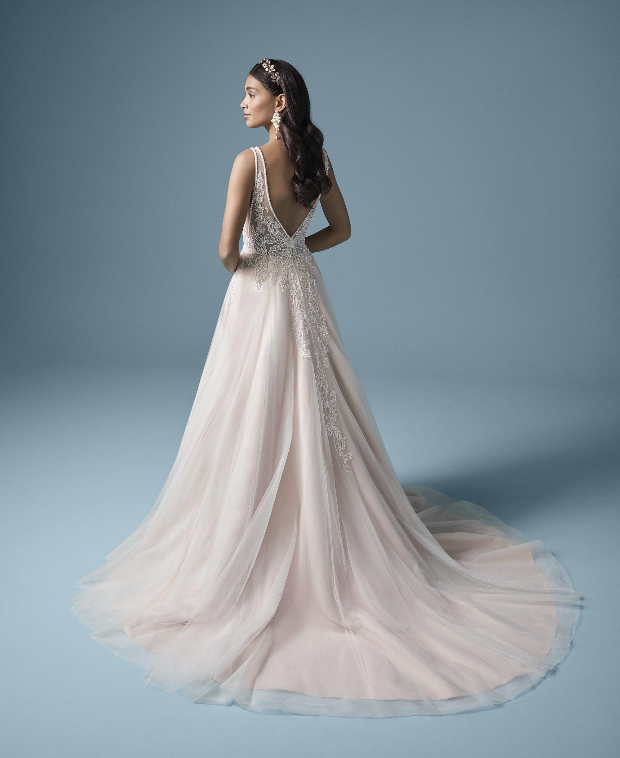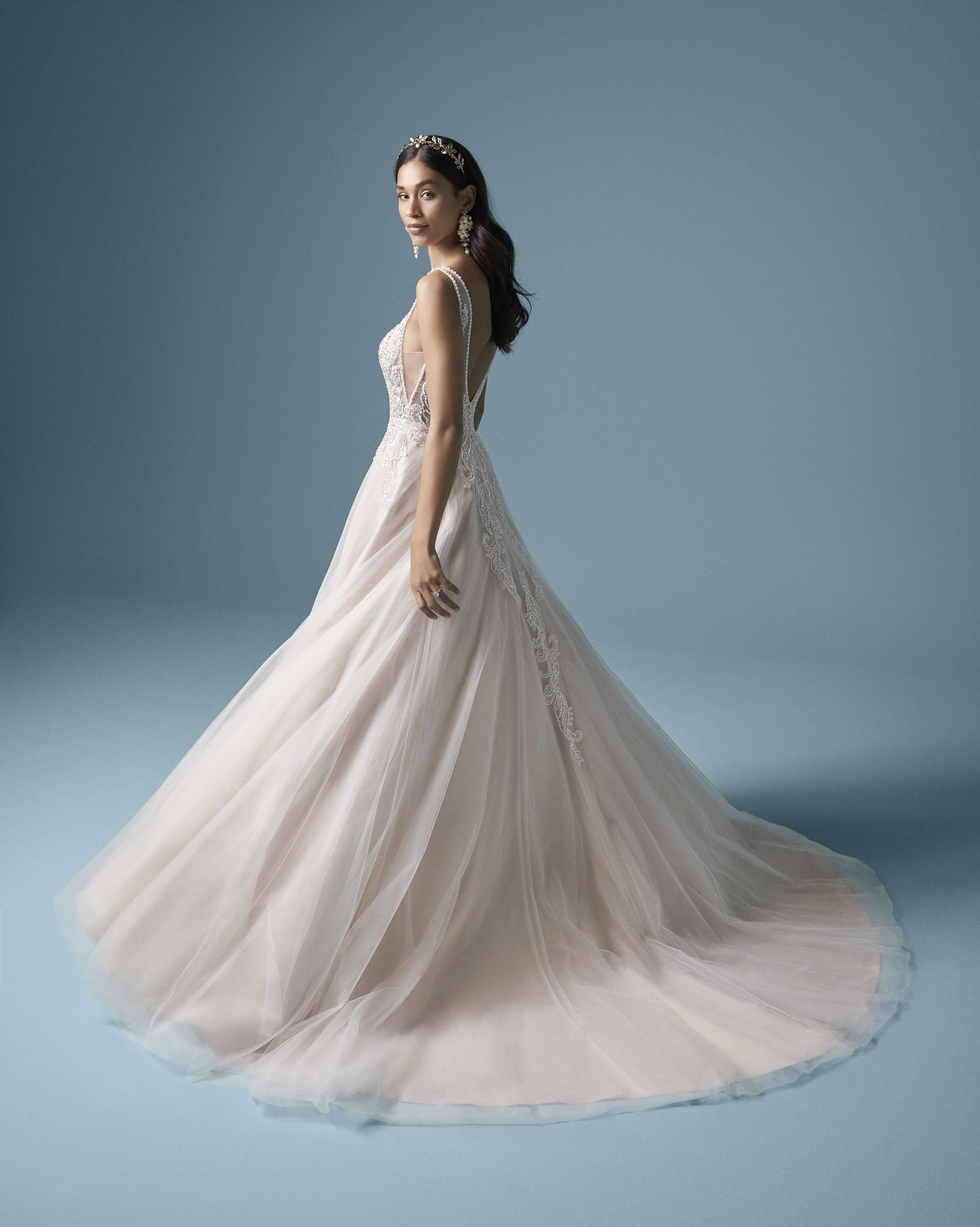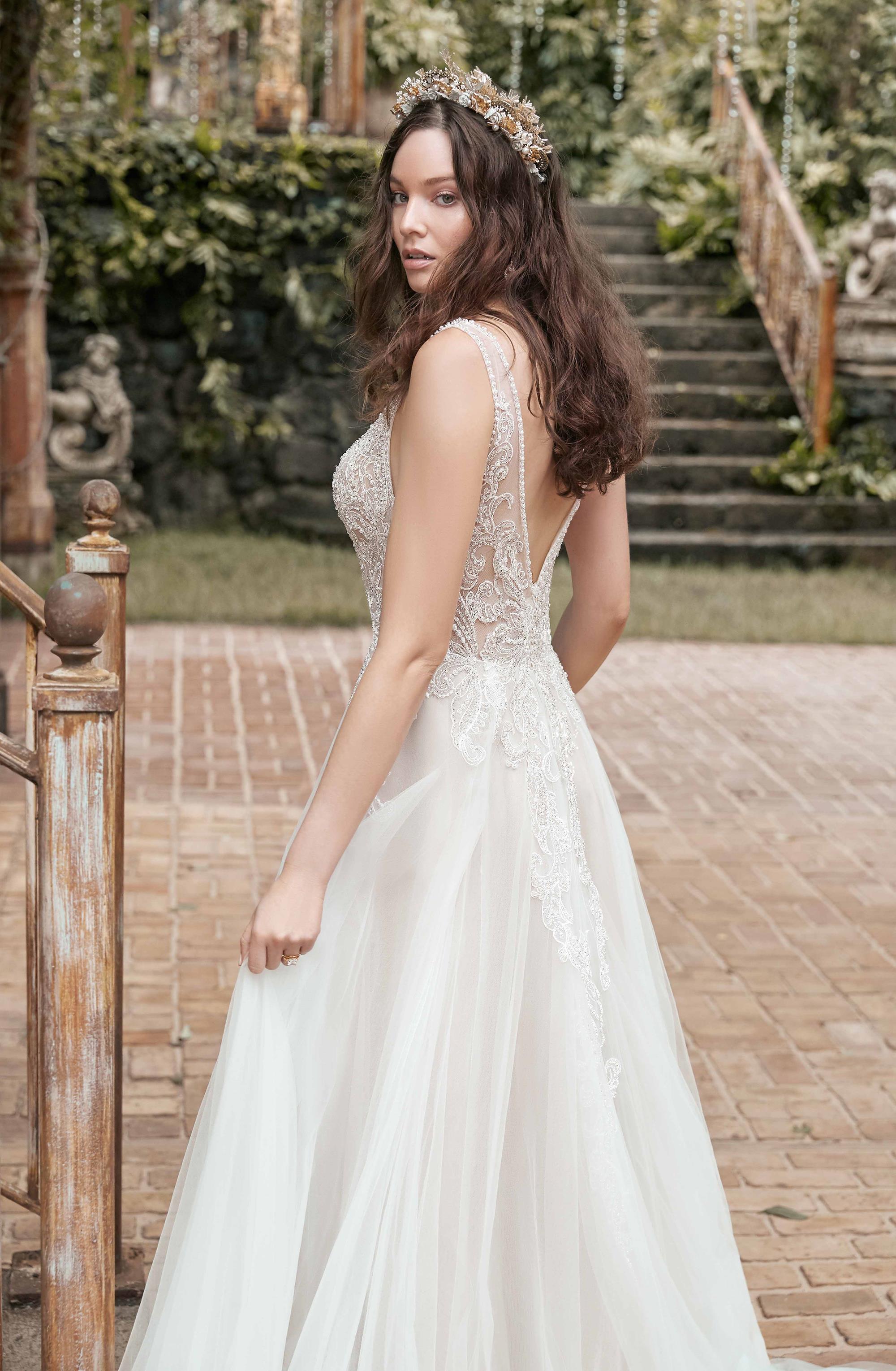Dreamy Deep V Aline gown! We love how this fits and flatters, and the beaded lace vines flowing into the mesh skirt is just the prettiest!