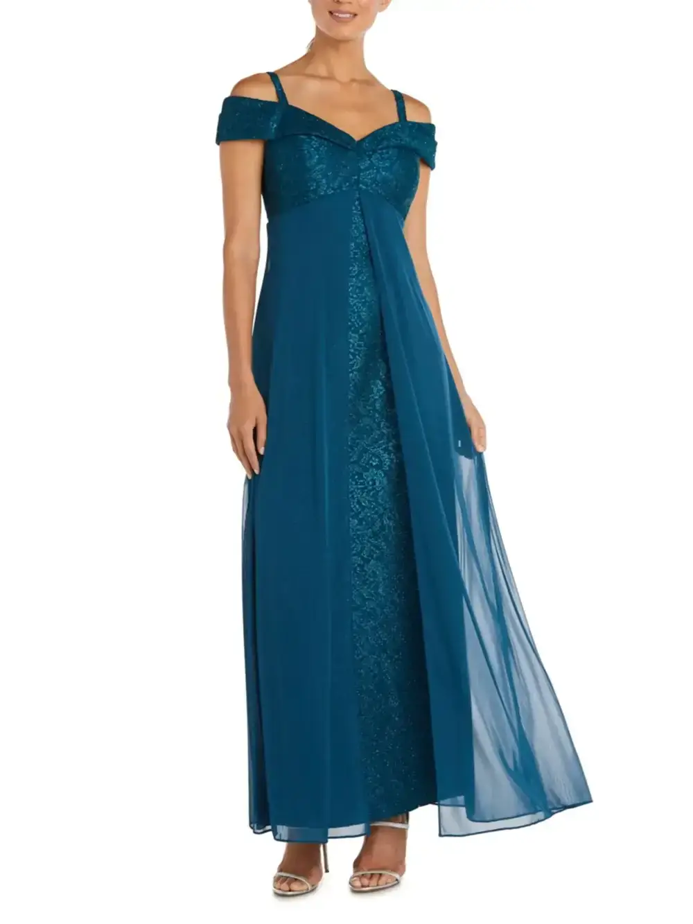 With a ruched sweetheart neckline, double-strap cold-shoulder design, and front-split chiffon overlay, it’s both flattering and unique.