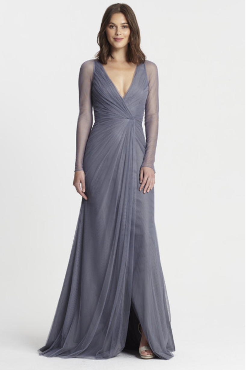 Monique Lhuillier Long Sheer Sleeve Evening Dress – Perfect for Special Occasions & Formal Events – High Vibe Bride, Mission KS Elegance and sophistication meet in this Monique Lhuillier evening dress crafted in soft gray mesh. Ideal for the Mother of the Bride, wedding guests, or any special occasion, this dress offers a flattering, contemporary silhouette perfect for formal events. The dress features a sleek column shape with graceful ruching that shapes and enhances the figure. The long sheer mesh sleeves add a touch of ethereal elegance, providing coverage while still feeling light and airy. The subtle gray hue gives a modern, refined feel, making it an exquisite choice for any evening celebration. Discover this stunning formal dress at High Vibe Bride in Mission, Kansas—where style, grace, and unforgettable moments come together.