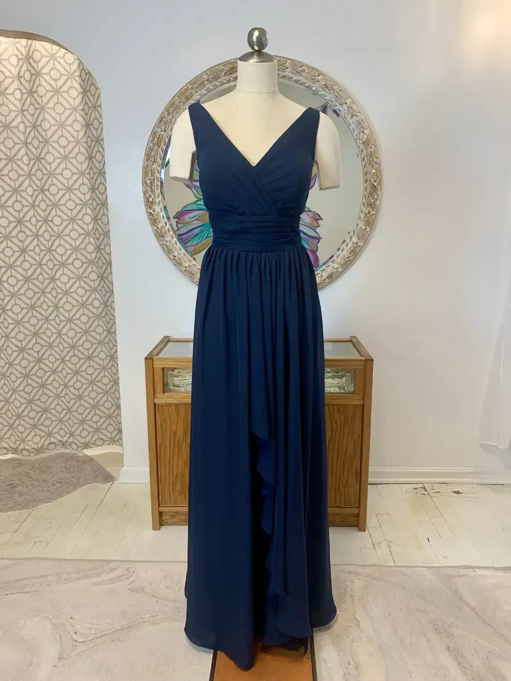 This dark navy chiffon bridesmaid dress blends elegance with easy, wearable comfort.