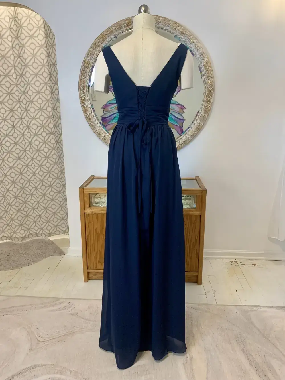 The floor length silhouette features a flattering V neckline in the front and back, plus a corset back for an adjustable, secure fit.