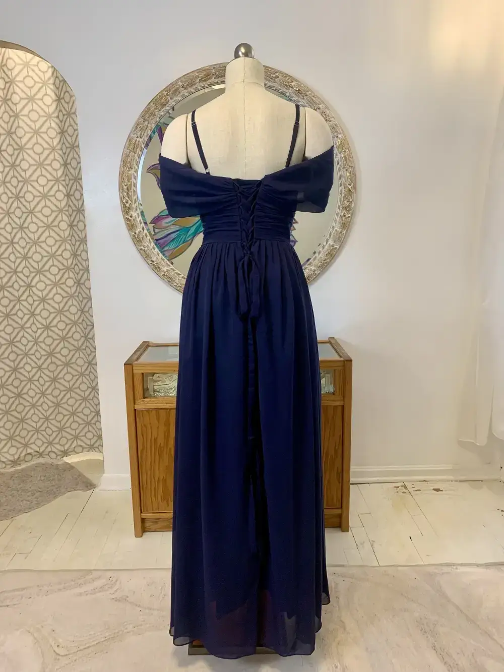 This navy floor-length A-line gown blends timeless elegance with modern ease, featuring a sweetheart neckline, pleated bust, and soft waist gathering that flatters every curve. The chic cold-shoulder design pairs off-shoulder draping with thin supportive straps, while the corset back provides a beautifully adjustable fit. A graceful skirt with a modern side slit adds movement, and yes, it even has pockets for that extra touch of magic. Perfect for Kansas City weddings, galas, and Mother of the Bride or Groom celebrations where comfort and sophistication meet.