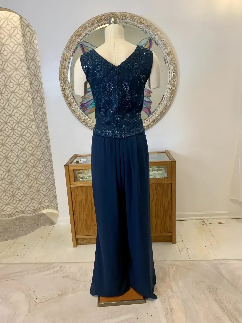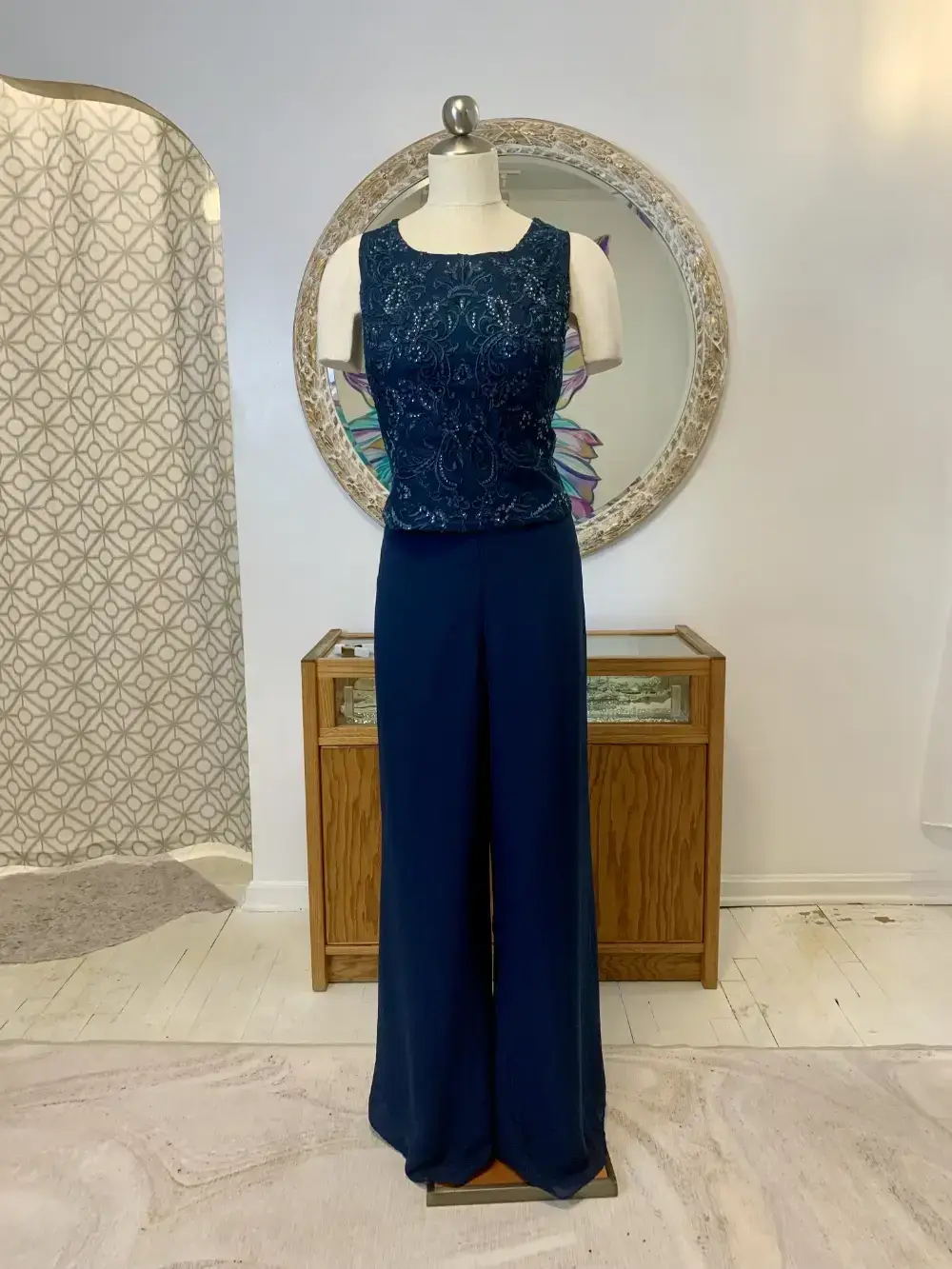 This chic pant suit delivers effortless elegance, featuring flowy high-waist straight-leg pants that create a long, flattering line. The waist-length top shines with thick supportive straps, a slightly rounded straight neckline, and a stunning floral sequined design that adds just the right amount of sparkle. Finished with a graceful V-back, this look is perfect for Kansas City mothers of the bride, mothers of the groom, and wedding guests who want modern style with easy, elevated comfort.