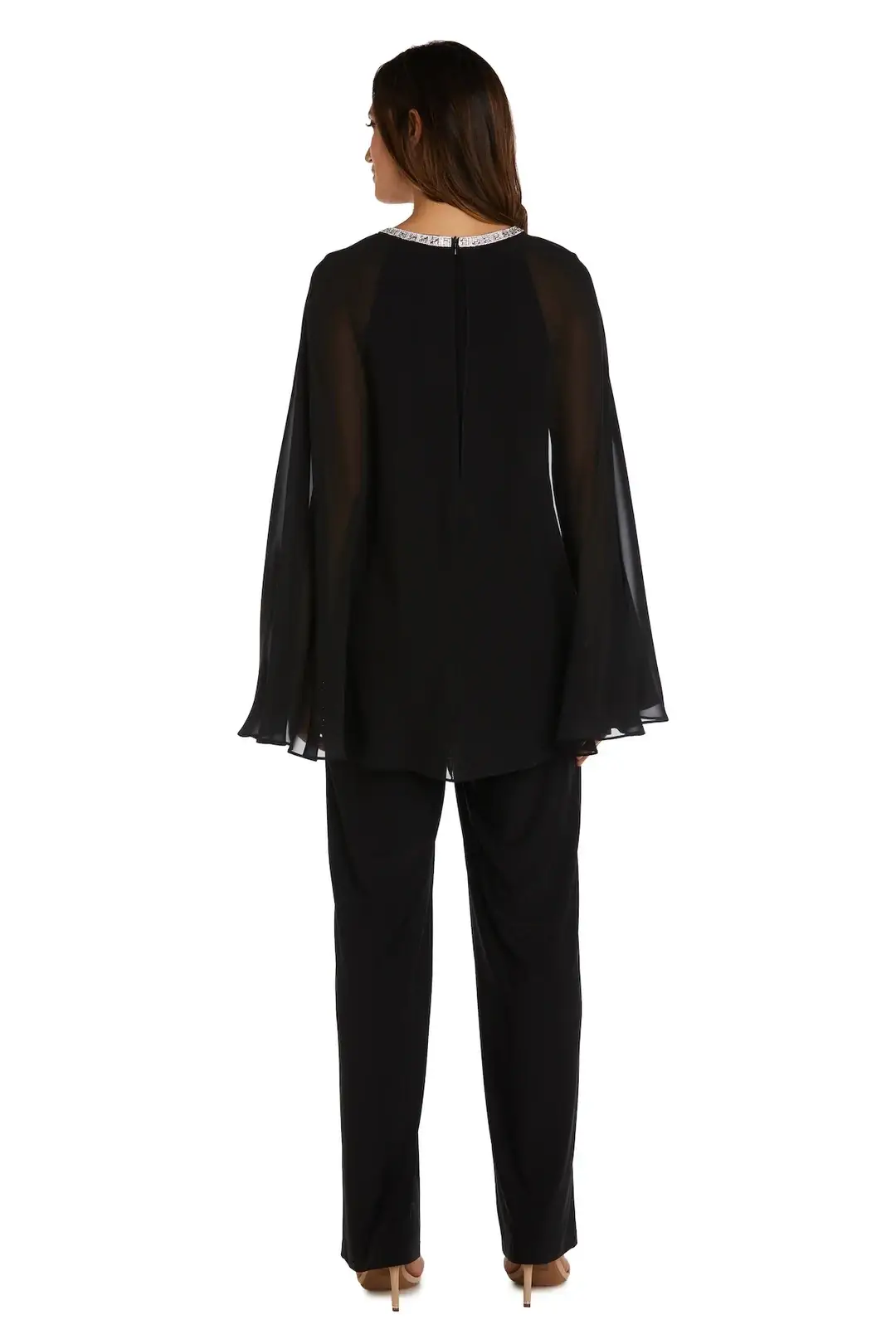 Elegant Black Capelet Pant Suit for Weddings & Special Events – High Vibe Bride, Mission KS Turn heads with timeless sophistication in this chic black capelet pant suit, perfect for the Mother of the Bride, wedding guests, or any special occasion. Designed for elegance and comfort, this modern ensemble is ideal for formal dinners, wedding receptions, or evening celebrations. The halter-style neckline features a dazzling rhinestone trim and a flattering keyhole front, adding just the right amount of sparkle. Soft sheer cape sleeves and a flowing cape back offer graceful coverage and eye-catching movement. The straight-leg pants have a pull-on design with a comfortable elastic waistband, making this outfit both polished and easy to wear. Shop this effortlessly stylish formal pant suit at High Vibe Bride in Mission, Kansas—where elevated fashion meets the moments that matter most.