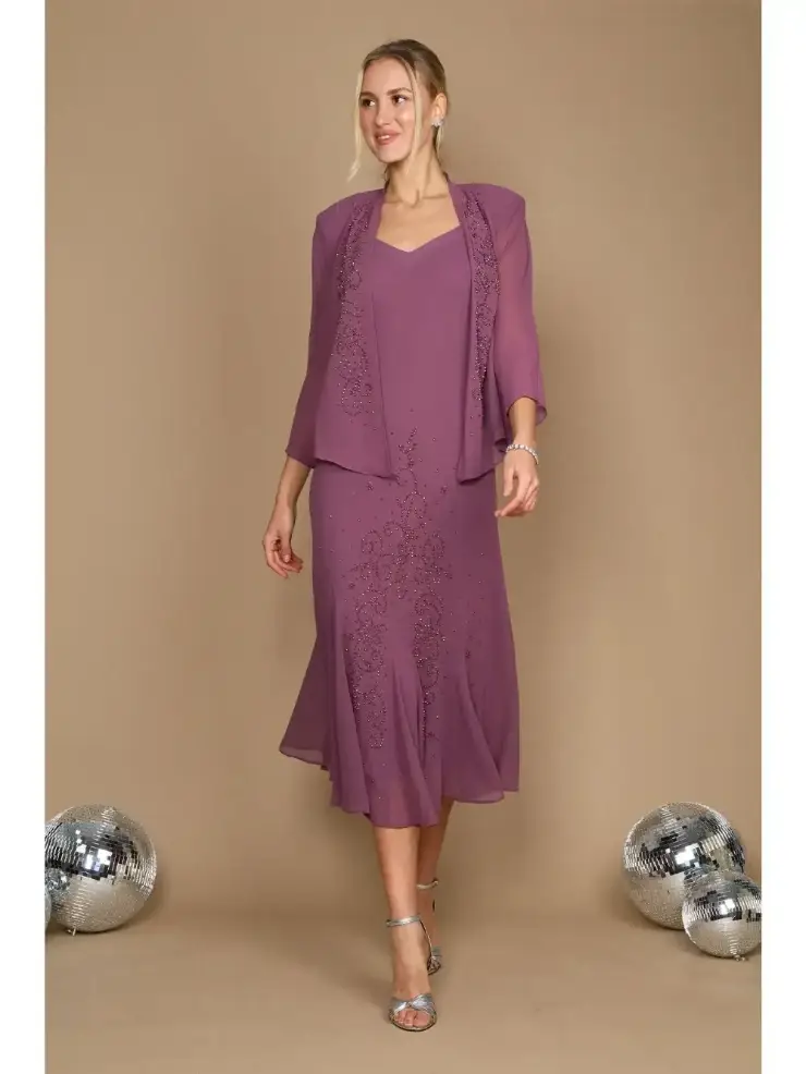 Beautiful dark rose ankle-length gown for the mother of the bride or mother of the groom, designed with a softly flared hem, delicate spaghetti straps, and an elegant matching jacket, accented with intricate beaded details, a graceful and versatile option for weddings, receptions, and formal celebrations in Kansas City.
