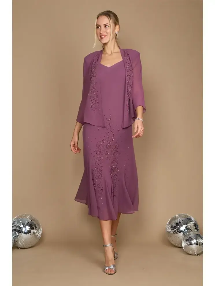 Classic and versatile, this ankle-length navy dress with spaghetti straps is paired with a matching beaded jacket for polished elegance. The flared hem adds movement, making it a perfect mother of the bride or mother of the groom dress for weddings and evening celebrations.