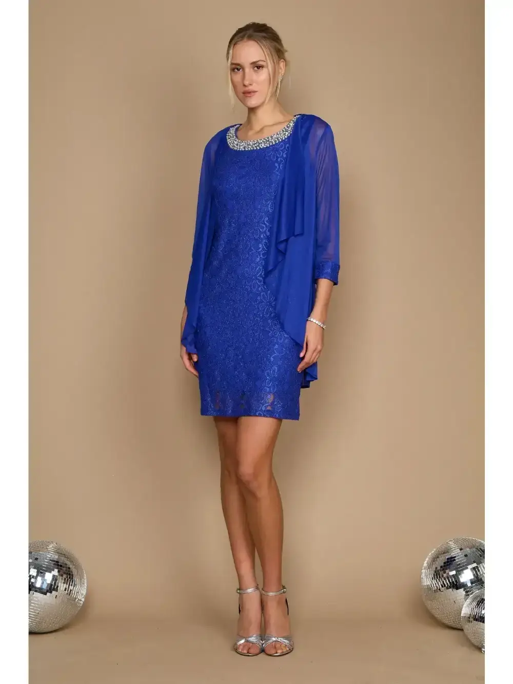 This knee length lace and sequin dress features a rounded pearl and beaded neckline for timeless elegance. Paired with a matte jacket with elbow length sleeves and hemline that matches the dress, this ensemble is perfect for formal weddings, cocktail evenings, or special occasions in Kansas City.