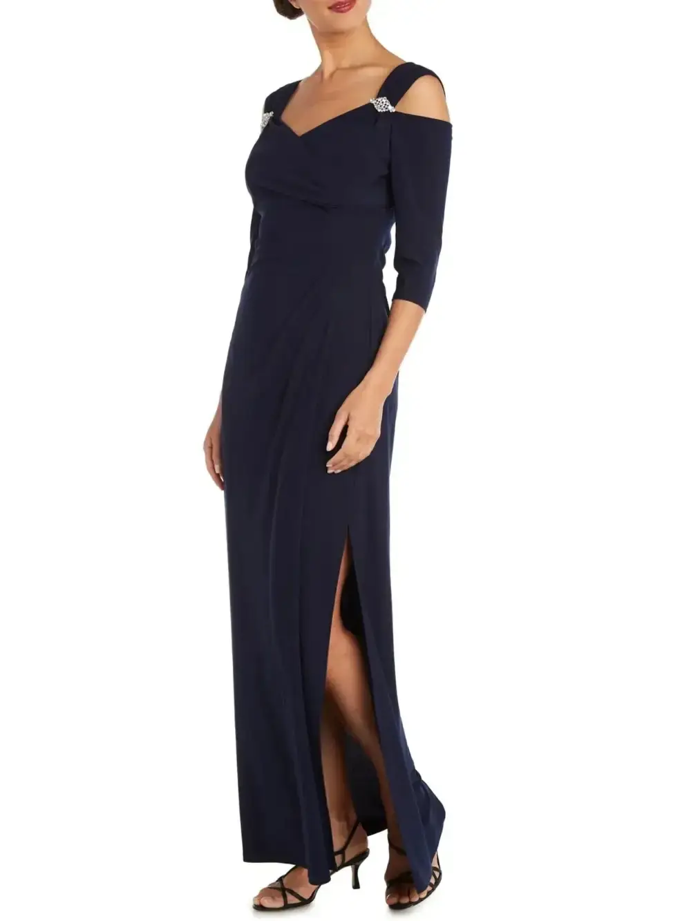 The 3/4 fitted sleeves and side slit add both comfort and allure, making it a flattering choice for Mother of the Bride or Groom, black-tie events, or holiday galas.