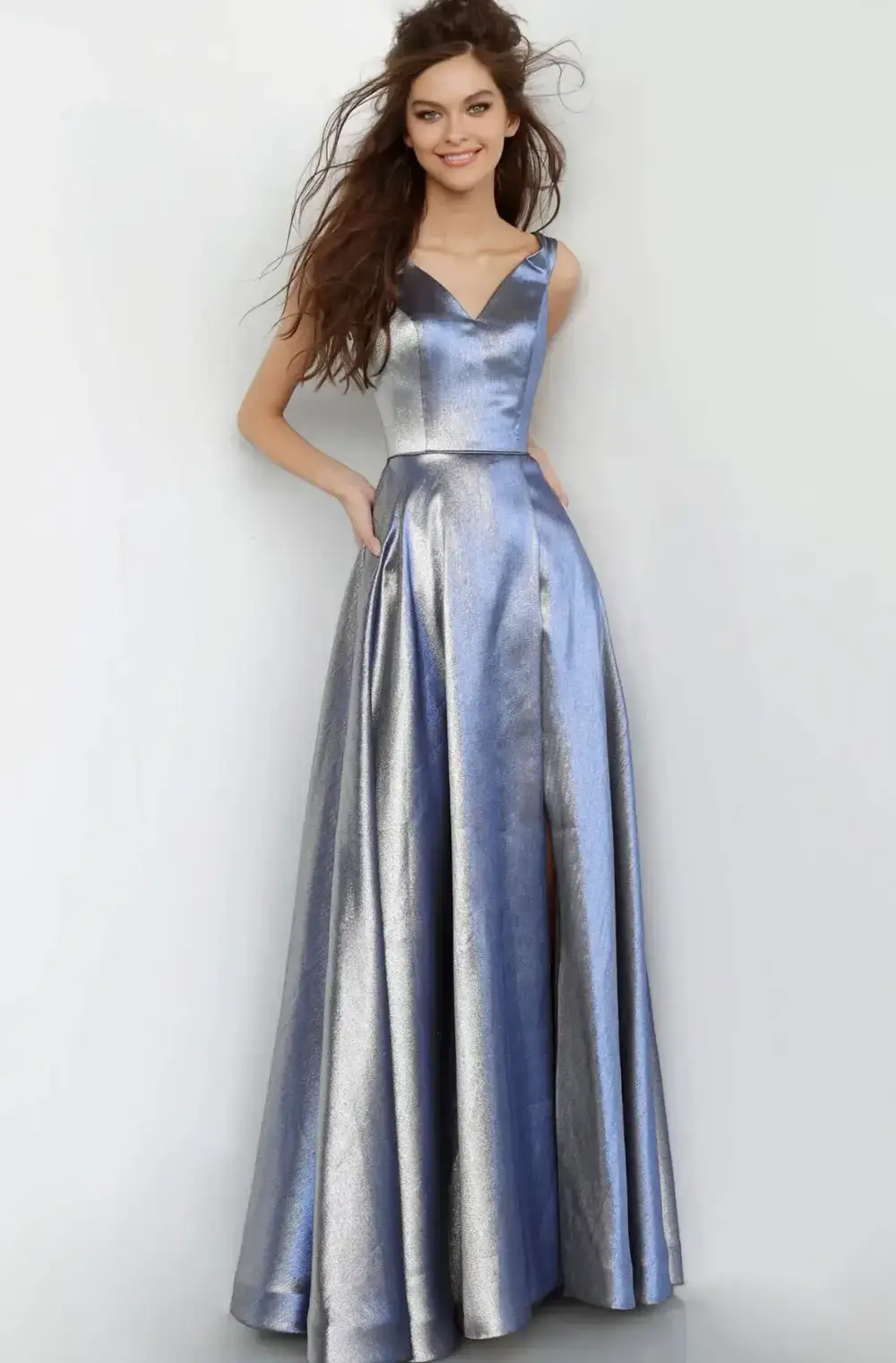 Iridescent Blue A-Line Dress with V-Neckline and Side Slit – Perfect for Mother of the Bride, Mother of the Groom & Special Occasions – High Vibe Bride, Mission KS Make an unforgettable entrance in this stunning iridescent blue A-line dress, designed to shimmer and shine at every angle. Featuring a flattering V-neckline in both the front and back, this gown brings a touch of elegance and modern edge to any special occasion. The flowing A-line silhouette is universally flattering and effortlessly graceful, while a side slit adds just the right amount of movement and sophistication. Perfect for the Mother of the Bride, Mother of the Groom, or any event where you want to feel both confident and radiant. This striking gown in a luminous iridescent blue hue is available now at High Vibe Bride in Mission, Kansas—your destination for timeless beauty and standout style for life’s most memorable moments.