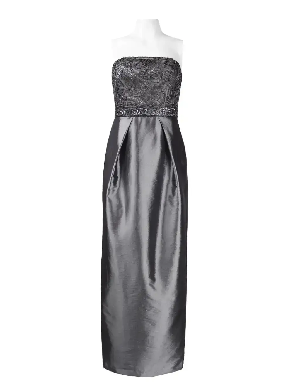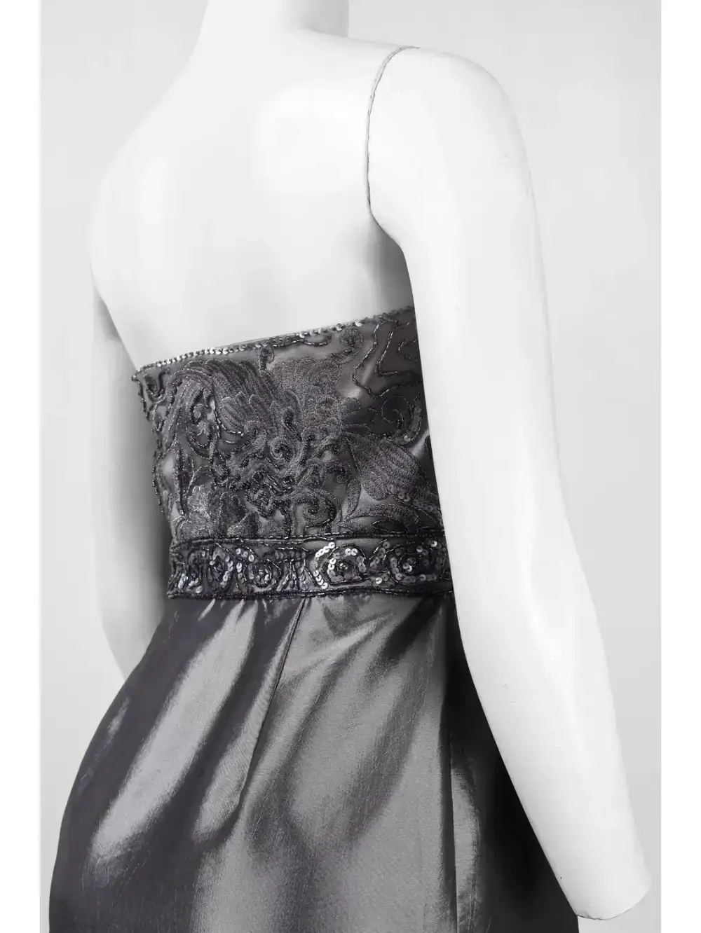 The bandeau-style bodice shimmers with charcoal and black beadwork, adding texture and dimension that beautifully catches the light.